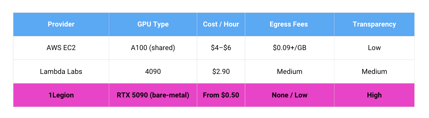 Scaling smart isn’t just about speed, it’s about control. Many AI founders are shocked when they realize egress, ingress, and storage costs weren’t included in the original quote. 1Legion’s model eliminates that uncertainty.